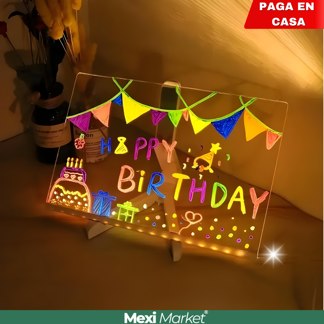El producto viene con un bolígrafo de 7 colores diferentes y un soporte que facilita su uso y exhibición, permitiéndote crear mensajes y dibujos vibrantes y personalizados.