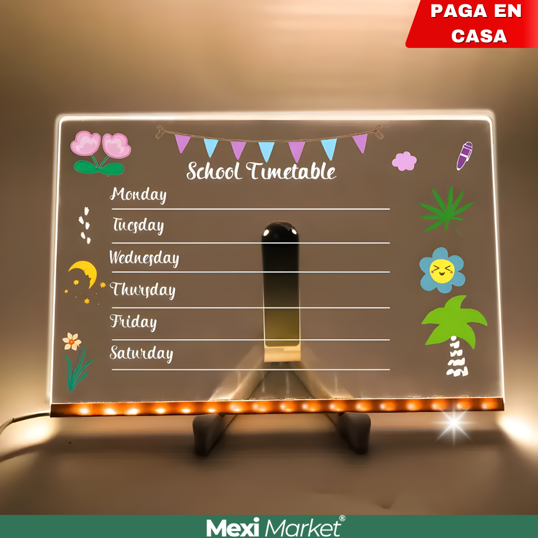 Esta pizarra cuenta con una iluminación LED que realza los colores brillantes de los bolígrafos incluidos, haciendo que tus mensajes y dibujos sean más atractivos y visibles