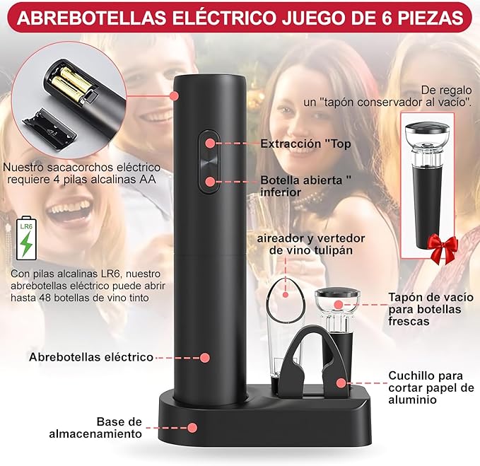 Sorprende a tus amigos y familiares con este destapacorchos eléctrico, el regalo ideal para cualquier ocasión especial. Perfecto para cenas, celebraciones y cualquier evento donde el vino sea protagonista.